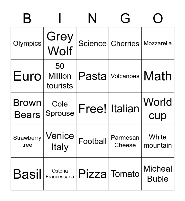 This bingo card has a free space and 25 words: Venice Italy, Pizza, Pasta, Basil, Mozzarella, Olympics, Euro, Grey Wolf, Italian, Football, Volcanoes, Brown Bears, Parmesan Cheese, White mountain, 50 Million tourists, Christmas, World cup, Science, Math, Cole Sprouse, Micheal Buble, Osteria Francescana, Strawberry tree, Cherries and Tomato.