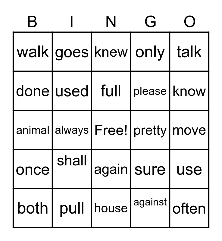 This bingo card has a free space and 24 words: shall, pull, full, both, talk, walk, done, goes, pretty, again, please, animal, sure, use, used, against, move, knew, know, always, often, once, only and house.