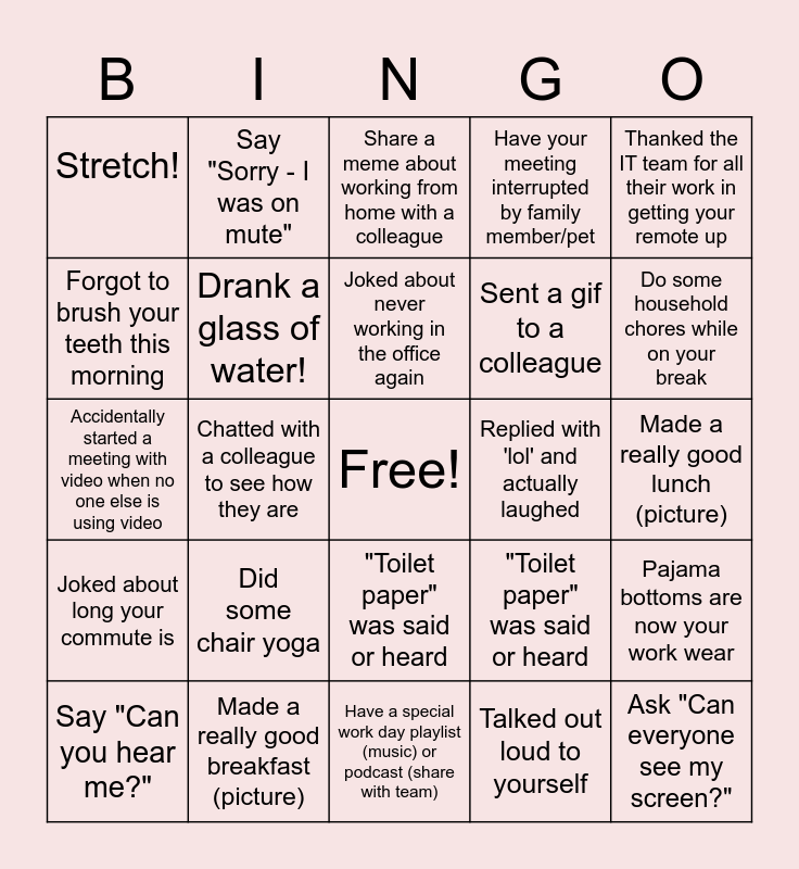 This bingo card has a free space and 25 words: Say "Can you hear me?", Did some chair yoga, Joked about never working in the office again, Talked out loud to yourself, Do some household chores while on your break, Stretch!, Say "Sorry - I was on mute", Share a meme about working from home with a colleague, Sent a gif to a colleague, Pajama bottoms are now your work wear, Accidentally started a meeting with video when no one else is using video, Drank a glass of water!, "Toilet paper" was said or heard, Ask "Can everyone see my screen?", Forgot to brush your teeth this morning, Made a really good breakfast (picture), Have a special work day playlist (music) or podcast (share with team), Have your meeting interrupted by family member/pet, Made a really good lunch (picture), Joked about long your commute is, Chatted with a colleague to see how they are, "Toilet paper" was said or heard, Replied with 'lol' and actually laughed, Thanked the IT team for all their work in getting your remote up and Give a coworker a shout out in huddle.