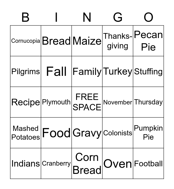 This bingo card has a free space and 24 words: Food, Cranberry, Family, Indians, Pecan Pie, Cornucopia, Pilgrims, Bread, November, Gravy, Turkey, Recipe, Colonists, Pumpkin Pie, Fall, Oven, Thursday, Maize, Stuffing, Plymouth, Football, Mashed Potatoes, Thanks-giving and Corn Bread.