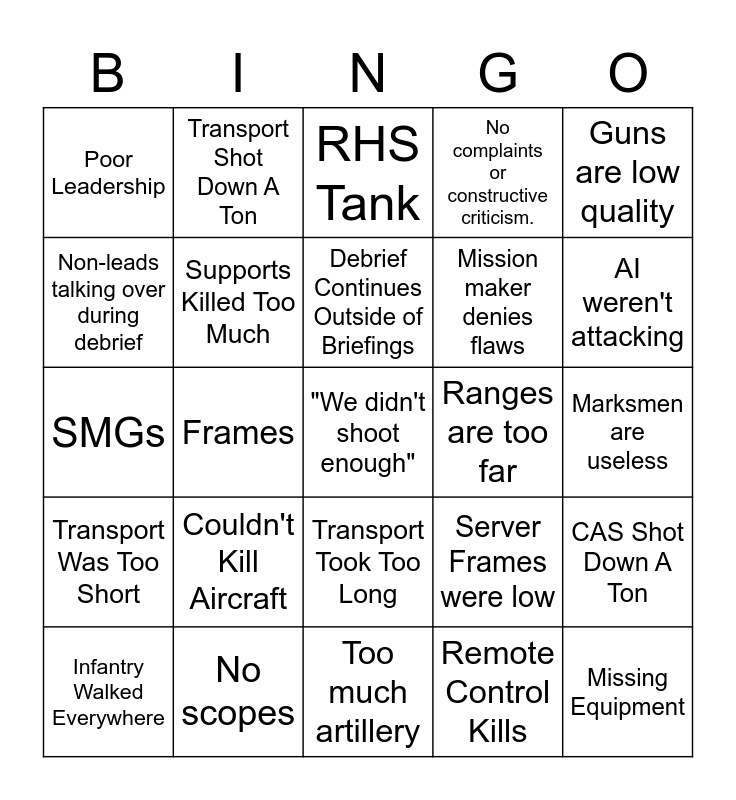 This bingo card has a free space and 29 words: Infantry Walked Everywhere, RHS Body Armor, Frames, Not enough AT, Poor Leadership, RHS Tank, Supports Killed Too Much, Couldn't Kill Aircraft, Ranges are too far, No scopes, Marksmen are useless, Missing Equipment, Too much artillery, Remote Control Kills, AI weren't attacking, Driving Simulator, Transport Took Too Long, Transport Was Too Short, Guns are low quality, SMGs, Server Frames were low, Unreasonable anger beyond words, Mission maker denies flaws, Non-leads talking over during debrief, No complaints or constructive criticism., Transport Shot Down A Ton, CAS Shot Down A Ton, Debrief Continues Outside of Briefings and We need more training.