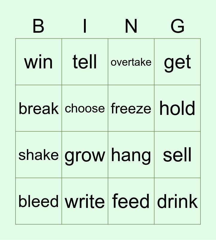 This bingo card has 16 words: write, sell, overtake, win, shake, tell, hang, feed, break, choose, bleed, get, grow, hold, freeze and drink.