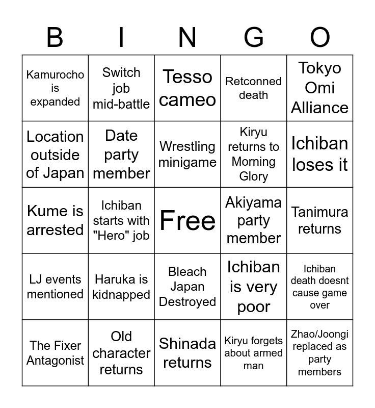 This bingo card has a free space and 24 words: Haruka is kidnapped, Old character returns, Wrestling minigame, The Fixer Antagonist, Tokyo Omi Alliance, Kamurocho is expanded, Location outside of Japan, Switch job mid-battle, Akiyama party member, Bleach Japan Destroyed, Kiryu returns to Morning Glory, Kume is arrested, Ichiban is very poor, Ichiban death doesnt cause game over, Date party member, Kiryu forgets about armed man, Tanimura returns, Tesso cameo, Ichiban loses it, Ichiban starts with "Hero" job, Zhao/Joongi replaced as party members, LJ events mentioned, Retconned death and Shinada returns.