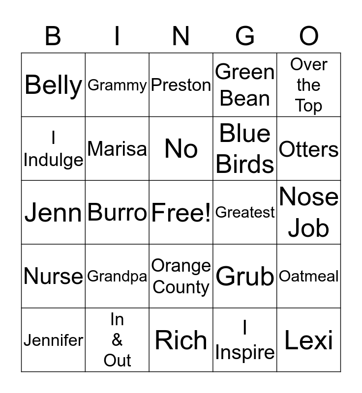 This bingo card has a free space and 24 words: Grandpa, In & Out, No, Jennifer, Over the Top, Belly, I Indulge, Grammy, Greatest, Orange County, Blue Birds, Jenn, Grub, Oatmeal, Marisa, I Inspire, Nose Job, Preston, Otters, Burro, Lexi, Nurse, Green Bean and Rich.
