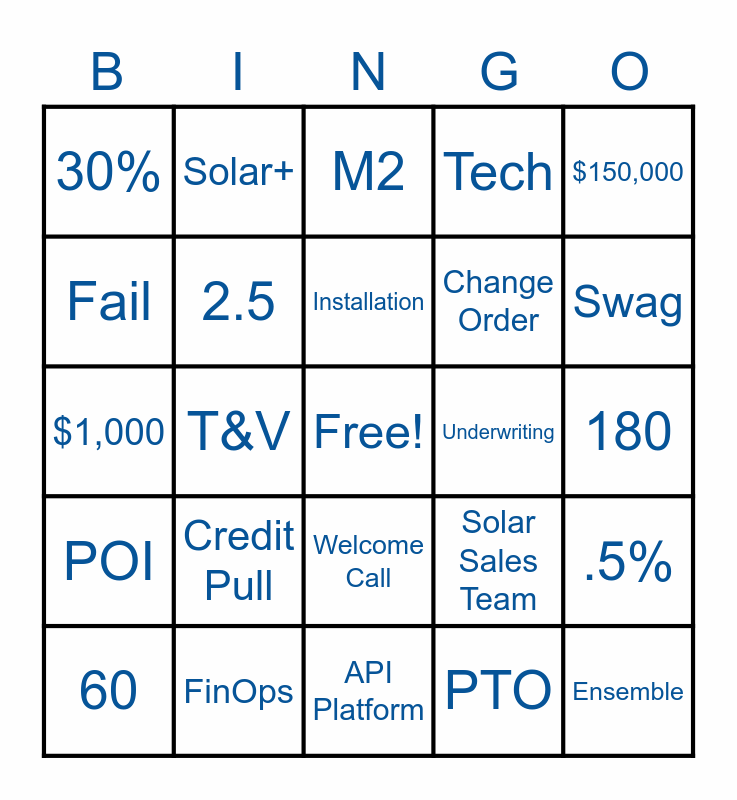 This bingo card has a free space and 24 words: Credit Pull, FinOps, Installation, 60, $150,000, 30%, Fail, Solar+, Underwriting, Welcome Call, Change Order, $1,000, Solar Sales Team, .5%, 2.5, PTO, 180, M2, Swag, T&V, Ensemble, POI, Tech and API Platform.