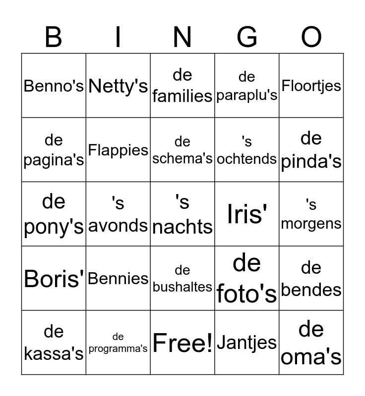 This bingo card has 31 words: Free!, de auto's, 's avonds, de baby's, Benno's, de families, Flappies, de foto's, Iris', Jantjes, 's morgens, 's nachts, de oma's, de piano's, de pinda's, de ziektes, de bendes, Bennies, Boris', de bushaltes, Floortjes, de gedaantes, de kassa's, Netty's, 's ochtends, de pagina's, de paraplu's, de pony's, de programma's, de schema's and 's winters.