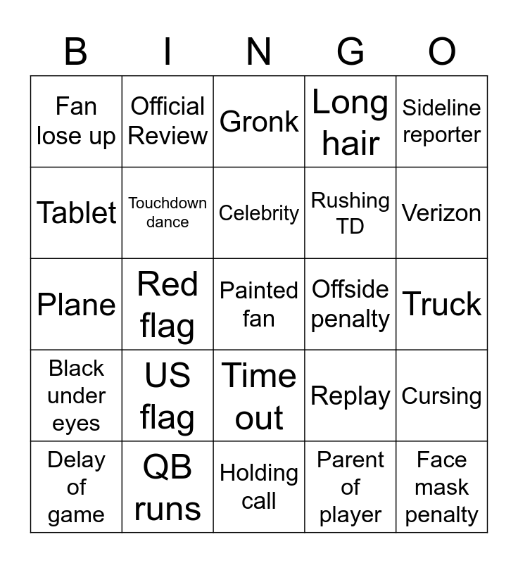 This bingo card has 80 words: Free!, Desert scene, Gronk, NFL Logo, Dog, Cowboy hat, Aerial view, Beard, Camera, Cell phone, Roman numerals, Apple, Long hair, Fan lose up, State Farm Logo, Tablet, Gatorade logo, US flag, Headphones, Truck, Cheerleader, Sideline reporter, Plane, Celebrity, Touchdown dance, One handed catch, Fan with sign/flag, Onside kick, Beer, Upset coach, Verizon, 2 pt conversion, Holding call, Face mask penalty, Delay of game, Offside penalty, Passing TD, PAT, False start, Painted fan, Betting Ad, Player points to End Zone, Hugging, Clydesdales, Doritos, Official Review, Coach hides mouth, Nike Logo, Chains out, Tied Score (not 0-0), Cursing, Red flag, Replay, Yellow flag, Black flag, Fair catch, Interception, QB Sack, 1st Down, Time out, Rushing TD, Field goal, Incomplete Pass, Fumble, Dark eye screen, Missed kick, Completed pass, Injured player, Punt, Tattoo, Black under eyes, QB runs, Lost helmet, Mouth piece, Unsportsmanship, Yellow shoes, Parent of player, Player jump on wall, Defense TD and Ref to Damar.