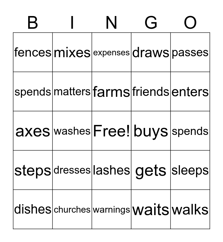 This bingo card has a free space and 24 words: dresses, churches, farms, dishes, passes, fences, spends, mixes, buys, lashes, friends, axes, gets, sleeps, matters, waits, spends, expenses, enters, washes, walks, steps, draws and warnings.