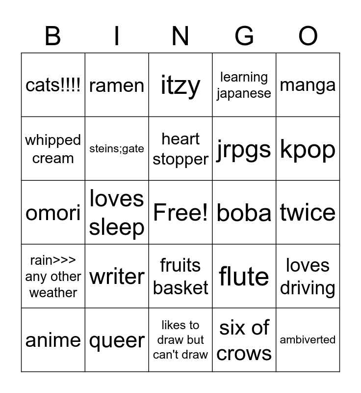 This bingo card has a free space and 24 words: writer, queer, heart stopper, anime, manga, cats!!!!, whipped cream, ramen, boba, fruits basket, jrpgs, omori, flute, loves driving, steins;gate, six of crows, twice, itzy, kpop, loves sleep, ambiverted, rain>>> any other weather, learning japanese and likes to draw but can't draw.