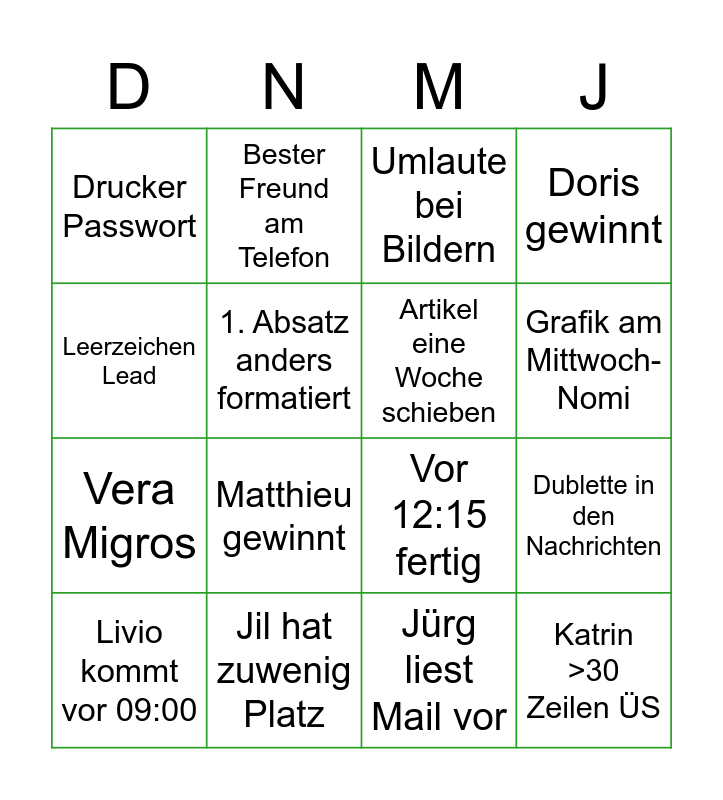 This bingo card has 16 words: Jil hat zuwenig Platz, Dublette in den Nachrichten, Umlaute bei Bildern, Drucker Passwort, Vera Migros, Bester Freund am Telefon, Vor 12:15 fertig, Jürg liest Mail vor, Leerzeichen Lead, 1. Absatz anders formatiert, Livio kommt vor 09:00, Doris gewinnt, Matthieu gewinnt, Grafik am Mittwoch-Nomi, Artikel eine Woche schieben and Katrin >30 Zeilen ÜS.