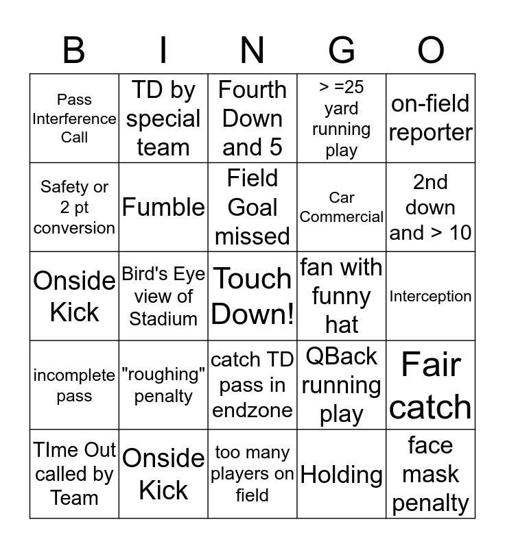 This bingo card has a free space and 24 words: "roughing" penalty, Onside Kick, Field Goal missed, TIme Out called by Team, on-field reporter, Pass Interference Call, Safety or 2 pt conversion, TD by special team, fan with funny hat, catch TD pass in endzone, Car Commercial, Onside Kick, QBack running play, Fair catch, Fumble, Holding, Interception, Fourth Down and 5, 2nd down and > 10, Bird's Eye view of Stadium, face mask penalty, incomplete pass, > =25 yard running play and too many players on field.