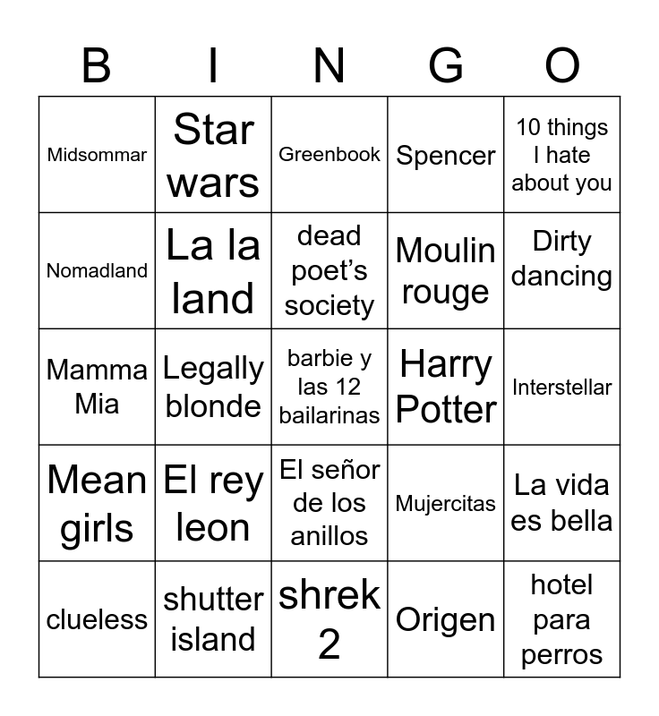 This bingo card has a free space and 24 words: El rey leon, shutter island, dead poet’s society, clueless, 10 things I hate about you, Midsommar, Nomadland, Star wars, Harry Potter, El señor de los anillos, Moulin rouge, Mamma Mia, Mujercitas, La vida es bella, La la land, Origen, Interstellar, Greenbook, Dirty dancing, Legally blonde, hotel para perros, Mean girls, Spencer and shrek 2.