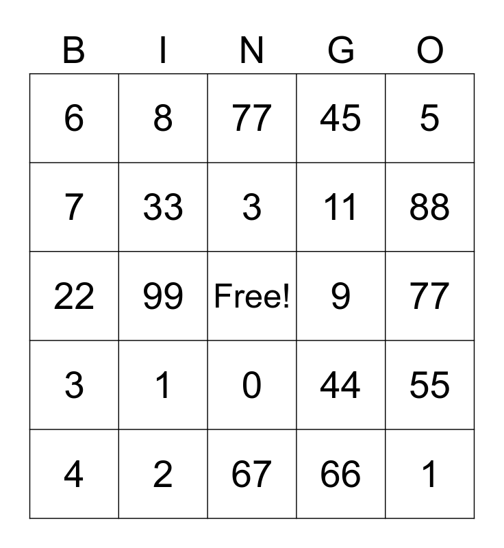 This bingo card has a free space and 24 words: 1, 2, 3, 4, 5, 6, 7, 8, 9, 0, 11, 22, 44, 55, 33, 66, 77, 77, 88, 99, 1, 3, 45 and 67.