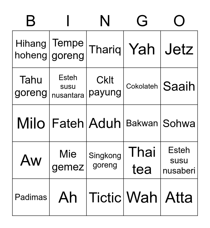 This bingo card has 25 words: Mie gemez, Tictic, Cklt payung, Padimas, Jetz, Hihang hoheng, Tahu goreng, Tempe goreng, Bakwan, Singkong goreng, Cokolateh, Milo, Thai tea, Esteh susu nusaberi, Esteh susu nusantara, Atta, Sohwa, Thariq, Saaih, Fateh, Aduh, Ah, Aw, Yah and Wah.