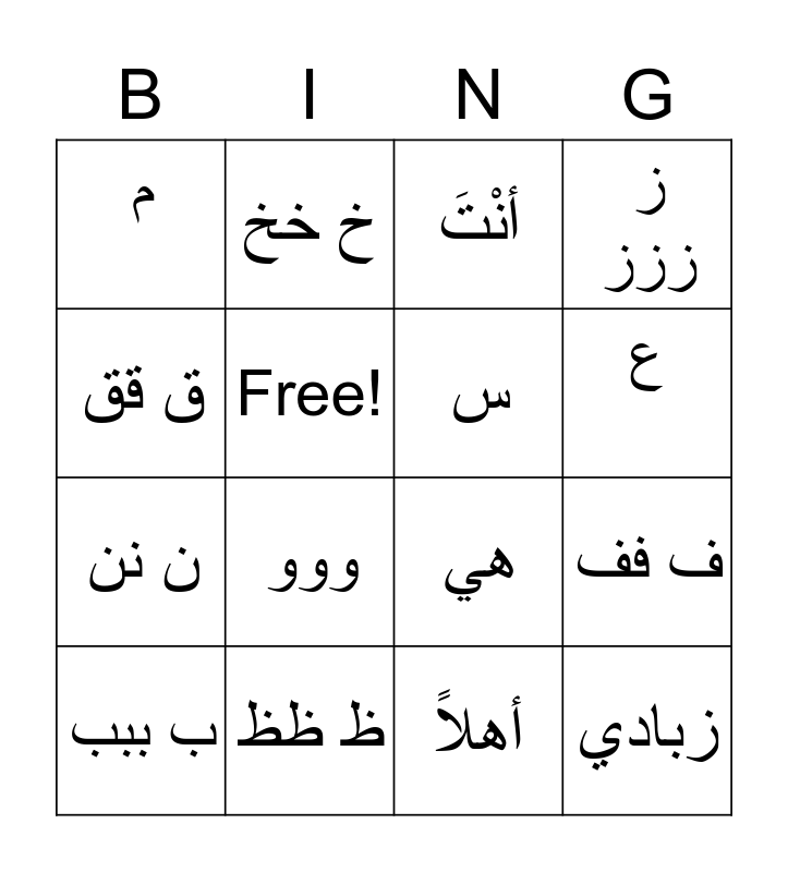 This bingo card has 48 words: ت تتت, ب ببب, ا, ج جج, ث ثث, ر ررر, خ خخ, ح حح, Free!, ش, س, ز ززز, ط طط, ض ضض, ص صص, غ غغغ, ع, ظ ظظ, ك كك, ق قق, ف فف, ل لل, م, ن نن, ه ههه, ووو, ي يي, باب, توت, زبادي, وزير, دين, بَيْت, بِنْت, بَيْن, بُنّي, تِبْن, أهلاً, صباح, سلامة, خُبْز, أنا, أنْتَ, هو, هي, تشرّفْنا, كيف and الحَمْدُ لله.