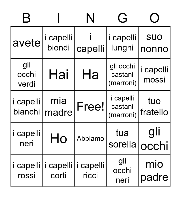 This bingo card has a free space and 28 words: gli occhi, gli occhi azzurri, gli occhi castani (marroni), gli occhi neri, gli occhi verdi, i capelli, i capelli biondi, i capelli neri, i capelli castani (marroni), i capelli rossi, i capelli bianchi, i capelli lunghi, i capelli corti, i capelli ricci, i capelli mossi, i capelli lisci, Ho, Hai, Ha, Abbiamo, avete, hanno, mio padre, mia madre, tuo fratello, tua sorella, suo nonno and sua nonna.