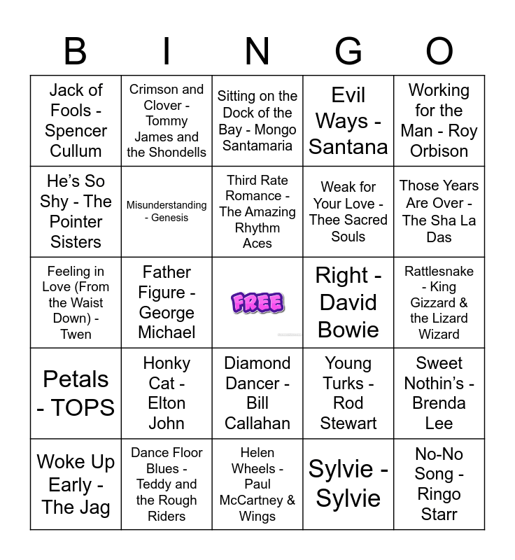 This bingo card has a free space and 51 words: Again - Lenny Kravitz, No-No Song - Ringo Starr, Get It While It’s Hot - Eddie Kendricks, Helen Wheels - Paul McCartney & Wings, Honky Cat - Elton John, Going Up The Country - Canned Heat, Crimson and Clover - Tommy James and the Shondells, Abracadabra - Steve Miller Band, He’s So Shy - The Pointer Sisters, Mellow Yellow - Donovan, Misunderstanding - Genesis, Evil Ways - Santana, Sweet Nothin’s - Brenda Lee, Young Turks - Rod Stewart, Betty Davis Eyes - Kim Carnes, Gold Dust Woman - Fleetwood Mac, Third Rate Romance - The Amazing Rhythm Aces, Right - David Bowie, Wake Up Little Susie - The Everly Brothers, Working for the Man - Roy Orbison, Father Figure - George Michael, Sylvie - Sylvie, Jack of Fools - Spencer Cullum, Weak for Your Love - Thee Sacred Souls, Plain As Your Eyes Can See - Jim Sullivan, Maria Tambien - Khruangbin, Those Years Are Over - The Sha La Das, Harbour - Cate le Bon, Woke Up Early - The Jag, Sitting on the Dock of the Bay - Mongo Santamaria, Let ‘Em In - Billy Paul, Dirty Work - The Pointer Sisters, Rugged Walk - The Rugged Nuggets, Found a Job - Talking Heads, Dream Free - Sam Evian ft. Hannah Cohen, Dance Floor Blues - Teddy and the Rough Riders, Watch Out - Wells Fargo, Long in the Tooth - The Budos Band, Nowhere to Run - Martha Reeves and the Vandellas, Kashmere - Kashmere Stage Band, Rattlesnake - King Gizzard & the Lizard Wizard, Petals - TOPS, Twistin’ the Night Away - Sam Cooke, The Weekend - SZA, Midnight Wine - Shannon and the Clams, Hey - Alvvays, Feeling in Love (From the Waist Down) - Twen, I Follow You - Melody’s Echo Chamber, She’s a Winner - Neal Francis, Diamond Dancer - Bill Callahan and La Grange - ZZ Top.
