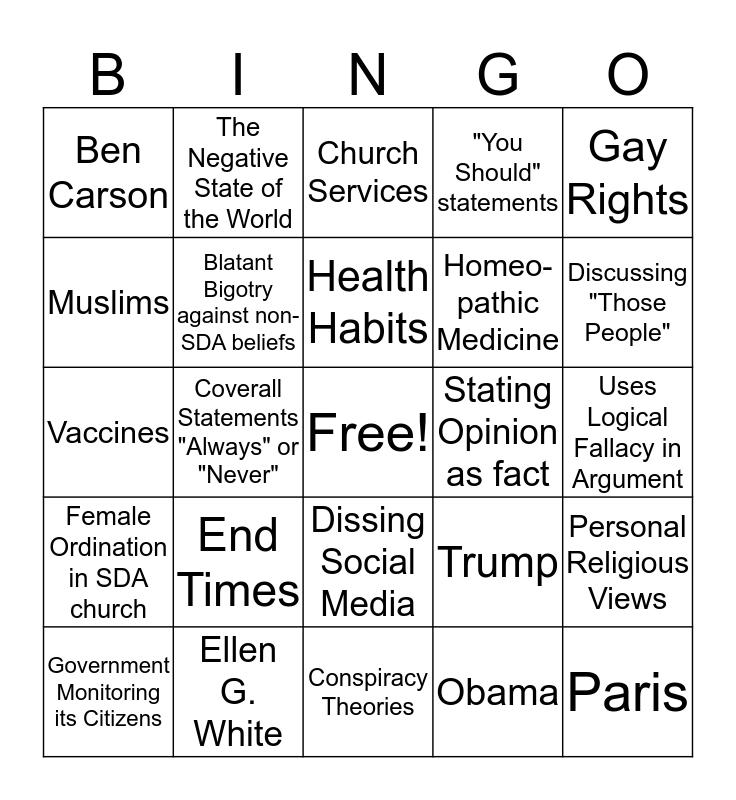 This bingo card has a free space and 24 words: End Times, Ellen G. White, Health Habits, Government Monitoring its Citizens, Gay Rights, Ben Carson, Muslims, The Negative State of the World, Stating Opinion as fact, Dissing Social Media, Homeo-pathic Medicine, Vaccines, Trump, Personal Religious Views, Blatant Bigotry against non-SDA beliefs, Obama, Uses Logical Fallacy in Argument, Church Services, Discussing "Those People", Coverall Statements "Always" or "Never", Paris, Female Ordination in SDA church, "You Should" statements and Conspiracy Theories.