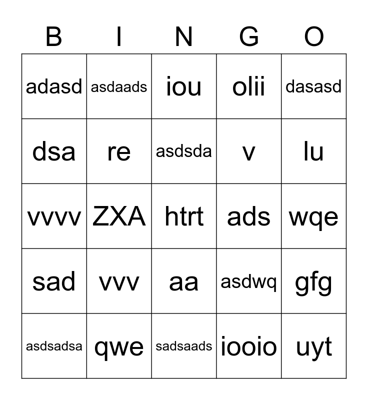 This bingo card has 25 words: vvv, sadsaads, asdsda, asdsadsa, dasasd, adasd, dsa, asdaads, ads, aa, v, vvvv, asdwq, gfg, re, uyt, wqe, iou, lu, ZXA, htrt, qwe, sad, olii and iooio.