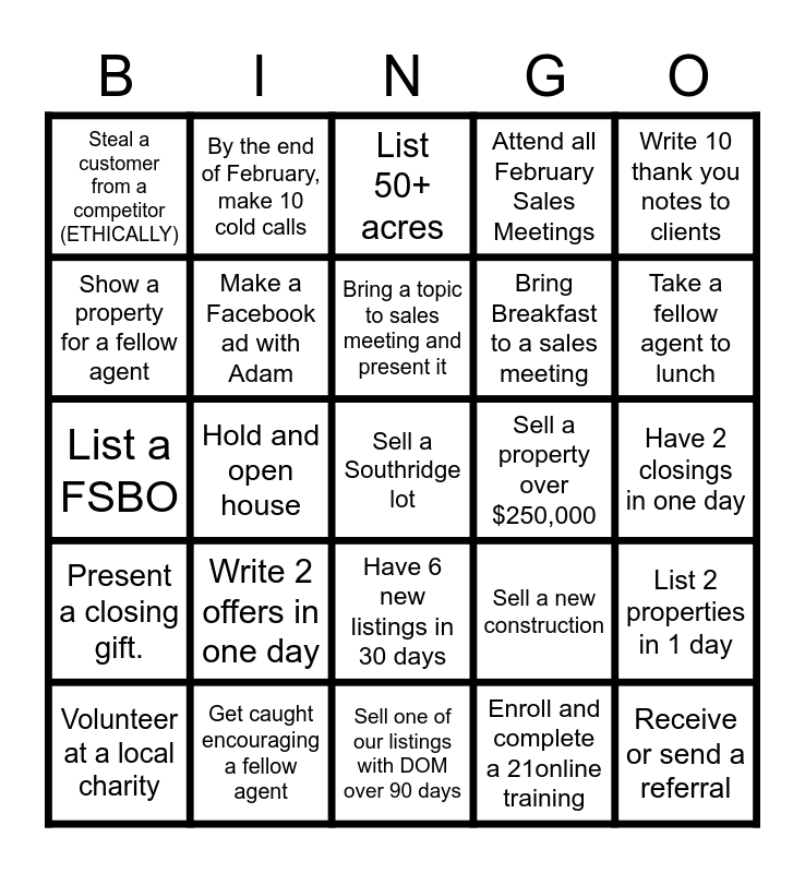This bingo card has 25 words: Write 2 offers in one day, Sell one of our listings with DOM over 90 days, Bring a topic to sales meeting and present it, Volunteer at a local charity, Write 10 thank you notes to clients, Steal a customer from a competitor (ETHICALLY), Show a property for a fellow agent, By the end of February, make 10 cold calls, Sell a property over $250,000, Have 6 new listings in 30 days, Bring Breakfast to a sales meeting, List a FSBO, Sell a new construction, List 2 properties in 1 day, Make a Facebook ad with Adam, Receive or send a referral, Have 2 closings in one day, List 50+ acres, Take a fellow agent to lunch, Hold and open house, Sell a Southridge lot, Get caught encouraging a fellow agent, Present a closing gift., Attend all February Sales Meetings and Enroll and complete a 21online training.