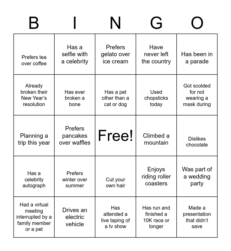 This bingo card has a free space and 24 words: Prefers winter over summer, Drives an electric vehicle, Has a pet other than a cat or dog, Had a virtual meeting interrupted by a family member or a pet, Has been in a parade, Prefers tea over coffee, Already broken their New Year’s resolution, Has a selfie with a celebrity, Climbed a mountain, Cut your own hair, Used chopsticks today, Planning a trip this year, Enjoys riding roller coasters, Was part of a wedding party, Has ever broken a bone, Has run and finished a 10K race or longer, Dislikes chocolate, Prefers gelato over ice cream, Got scolded for not wearing a mask during, Prefers pancakes over waffles, Made a presentation that didn’t save, Has a celebrity autograph, Have never left the country and Has attended a live taping of a tv show.