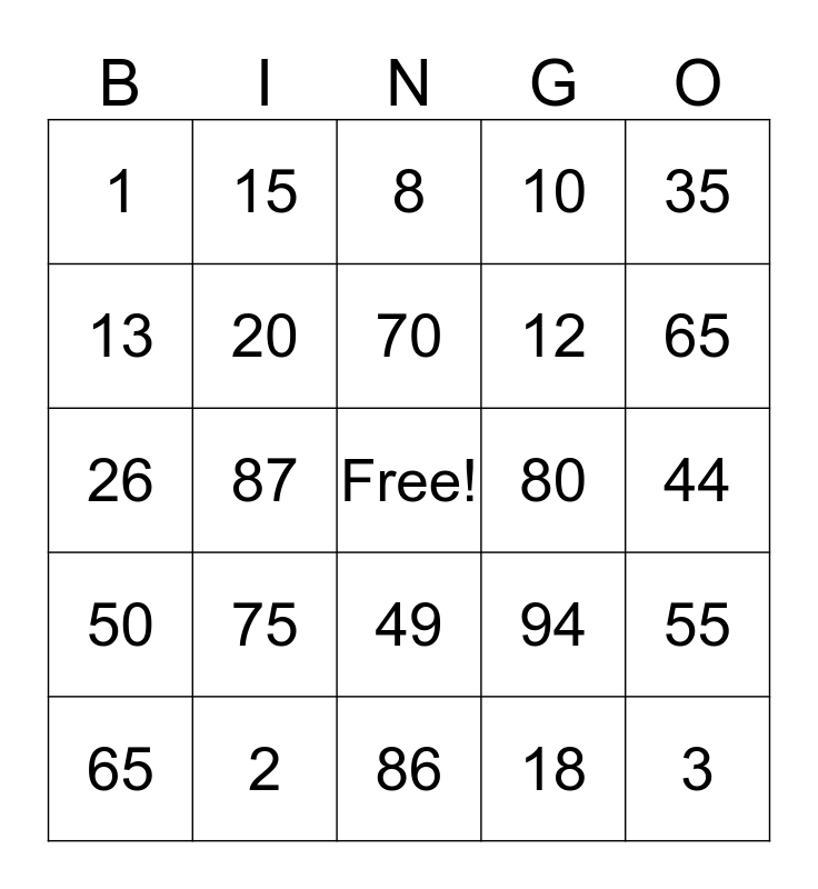 This bingo card has a free space and 24 words: 75, 2, 70, 65, 35, 1, 13, 15, 80, 49, 12, 26, 94, 55, 20, 18, 44, 8, 65, 87, 3, 50, 10 and 86.