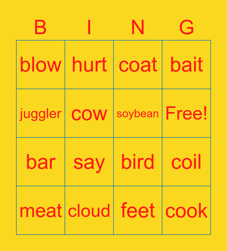 This bingo card has 17 words: feet, meat, coat, blow, say, bait, coil, soybean, Free!, cow, cloud, bird, juggler, hurt, bar, sort and cook.