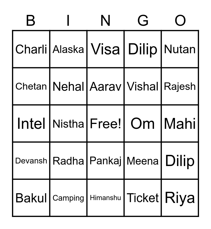 This bingo card has a free space and 39 words: Rutvi, Rudra, Bina, Nehal, Bakul, Pankaj, Aarav, Heena, Nutan, Devansh, Nistha, Dilip, Riya, Mahi, Om, Radha, Neel, Charli, Parin, Meena, Chetan, Himanshu, Vishal, Rajesh, 40th, Cake, Party, Friends, Catan, Alaska, Cruise, Canada, Visa, Camping, Ticket, Motel, Dilip, Intel and Surat.