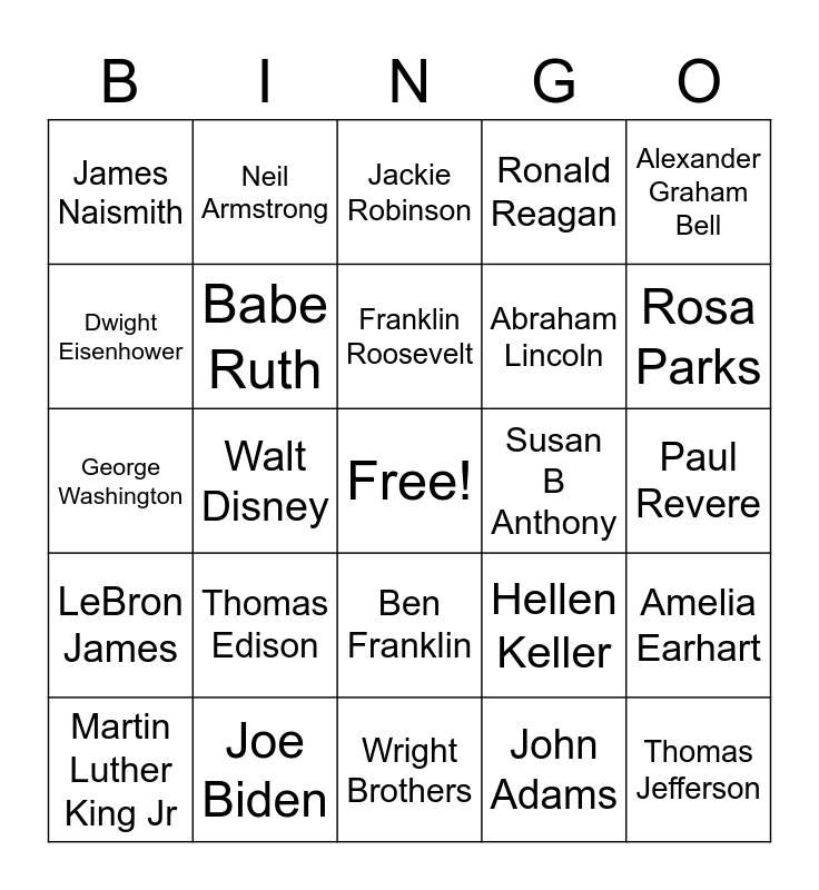 This bingo card has a free space and 24 words: Thomas Edison, Joe Biden, Franklin Roosevelt, Martin Luther King Jr, Alexander Graham Bell, James Naismith, Dwight Eisenhower, Neil Armstrong, Susan B Anthony, Ben Franklin, Abraham Lincoln, George Washington, Hellen Keller, Amelia Earhart, Babe Ruth, John Adams, Paul Revere, Jackie Robinson, Rosa Parks, Walt Disney, Thomas Jefferson, LeBron James, Ronald Reagan and Wright Brothers.