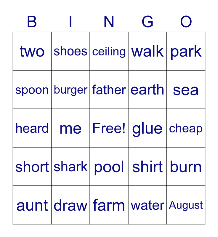 This bingo card has a free space and 25 words: shark, farm, father, aunt, park, two, spoon, shoes, glue, pool, earth, heard, shirt, burn, burger, keep, cheap, ceiling, sea, me, August, draw, short, walk and water.