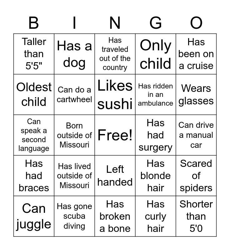 This bingo card has a free space and 24 words: Has lived outside of Missouri, Has gone scuba diving, Likes sushi, Can juggle, Has been on a cruise, Taller than 5'5", Oldest child, Has a dog, Has had surgery, Left handed, Has ridden in an ambulance, Can speak a second language, Has blonde hair, Scared of spiders, Can do a cartwheel, Has curly hair, Can drive a manual car, Has traveled out of the country, Wears glasses, Born outside of Missouri, Shorter than 5'0, Has had braces, Only child and Has broken a bone.