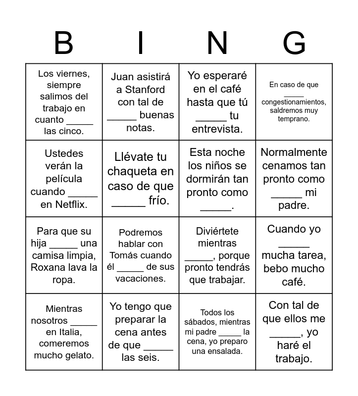 This bingo card has 24 words: Tú tendrás que _____ el subjuntivo antes de tomar el examen el viernes., Nosotros iremos a la playa mañana a menos que _____., Normalmente cenamos tan pronto como _____ mi padre., Mariana sale con su novio sin que sus padres lo _____., Ustedes verán la película cuando _____ en Netflix., Los viernes, siempre salimos del trabajo en cuanto _____ las cinco., Llévate tu chaqueta en caso de que _____ frío., Juan asistirá a Stanford con tal de _____ buenas notas., Yo tengo que preparar la cena antes de que _____ las seis., A menos que tú no _____ ir, nosotros pensamos visitar el parque zoológico esta tarde., Para que su hija _____ una camisa limpia, Roxana lava la ropa., Diviértete mientras _____, porque pronto tendrás que trabajar., Por la noche, yo siempre leo en la cama hasta _____., Saldremos para la escuela después de que Papá _____ las noticias., Esta noche los niños se dormirán tan pronto como _____., Tú tienes que trabajar mucho para _____ millones de dólares., Todos los sábados, mientras mi padre _____ la cena, yo preparo una ensalada., Yo esperaré en el café hasta que tú _____ tu entrevista., Podremos hablar con Tomás cuando él _____ de sus vacaciones., Cuando yo _____ mucha tarea, bebo mucho café., Mientras nosotros _____ en Italia, comeremos mucho gelato., Con tal de que ellos me _____, yo haré el trabajo., En caso de que _____ congestionamientos, saldremos muy temprano. and Antes de que todos los tigres _____, los salvaremos..