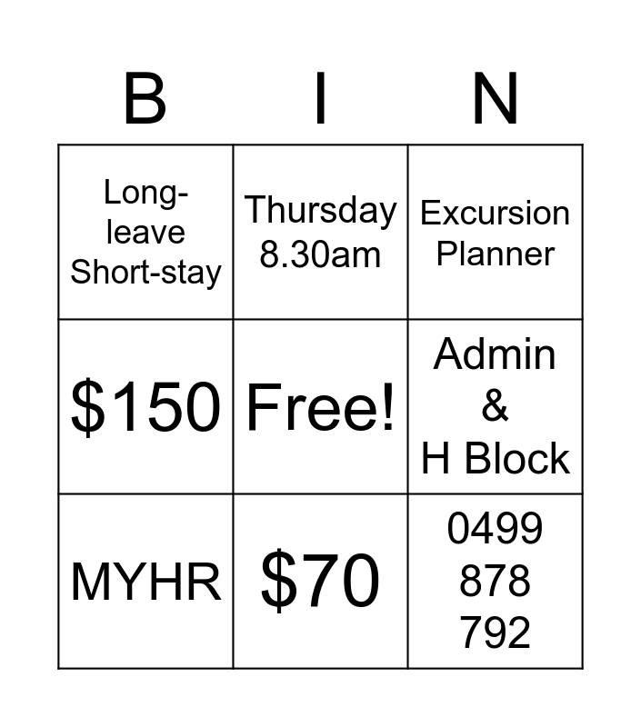 This bingo card has a free space and 23 words: Nearest Classroom, 27 January 7.45am, $70, SOBS, 0499 878 792, Long-leave Short-stay, Admin & H Block, Thursday 8.30am, 8899#, Dial 9, ADO, TLC, Friday 8.15am, Specialist Timetable, BYO iPad, Flexischools, Excursion Planner, Black bucket, MYHR, Duty Teacher, $150, Homework Grid and Tier 3.