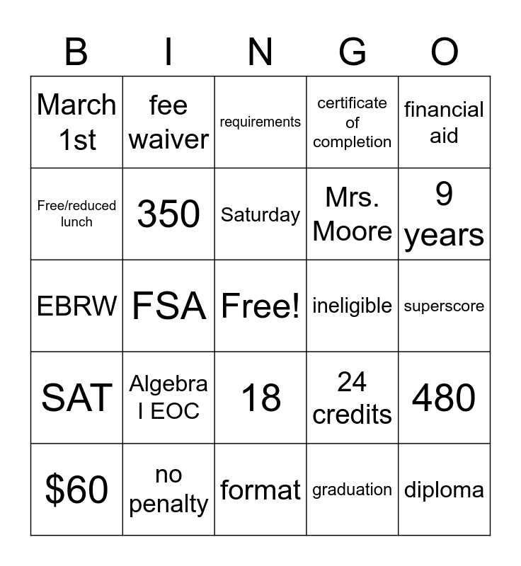 This bingo card has a free space and 32 words: graduation, 2023, FSA, ACT, SAT, 350, financial aid, 480, fee waiver, IEP waiver, Saturday, requirements, armed forces, entry-level, ineligible, ready?, $60, EBRW, 18, Algebra I EOC, 24 credits, 2.0 GPA, superscore, no penalty, diploma, certificate of completion, Mrs. Moore, Free/reduced lunch, March 1st, format, no blanks ever and 9 years.
