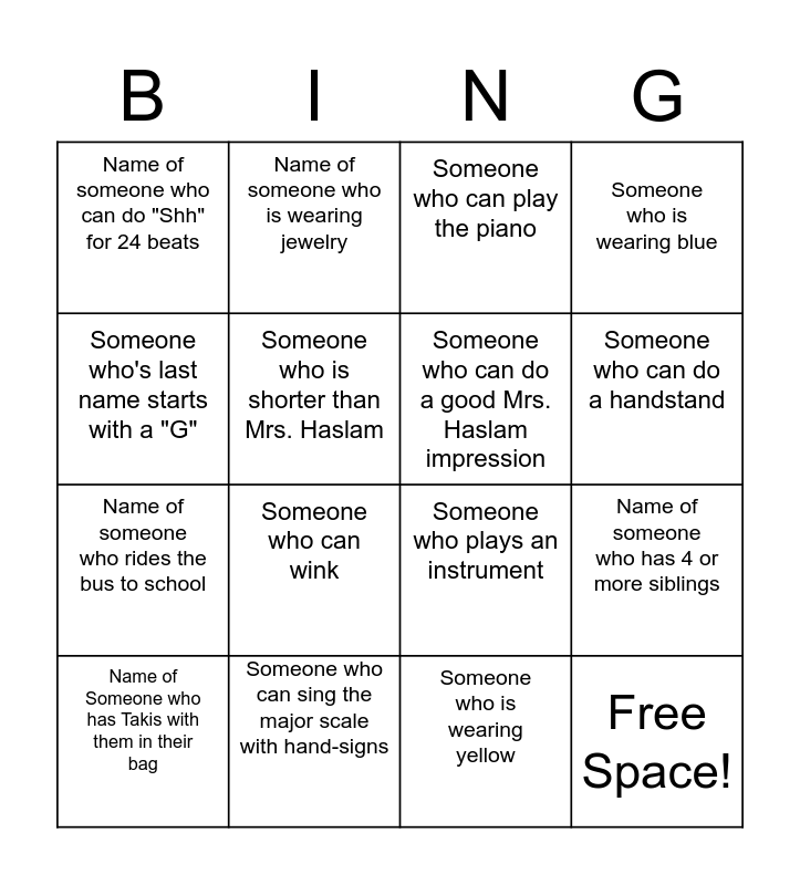 This bingo card has 16 words: Someone who can sing the major scale with hand-signs, Name of someone who has 4 or more siblings, Someone who can play the piano, Name of someone who can do "Shh" for 24 beats, Name of someone who rides the bus to school, Name of someone who is wearing jewelry, Someone who plays an instrument, Someone who is wearing yellow, Someone who's last name starts with a "G", Someone who is shorter than Mrs. Haslam, Name of Someone who has Takis with them in their bag, Someone who is wearing blue, Someone who can wink, Someone who can do a handstand, Someone who can do a good Mrs. Haslam impression and Free Space!.