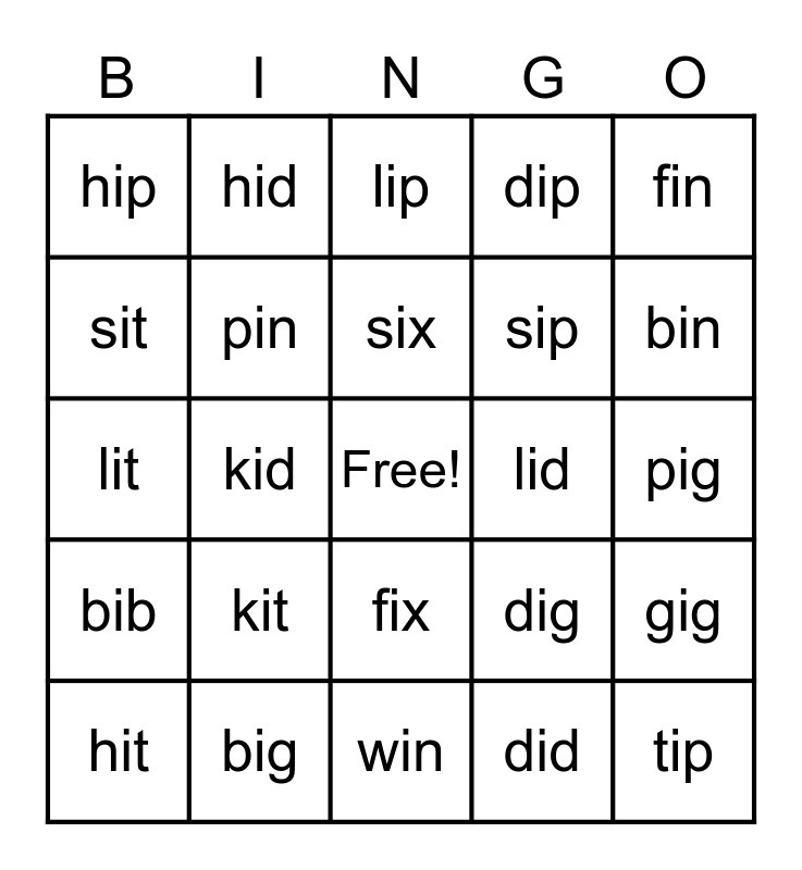 This bingo card has a free space and 24 words: kit, big, six, hit, fin, hip, sit, hid, lid, fix, sip, lit, dig, gig, pin, did, pig, lip, bin, kid, tip, bib, dip and win.