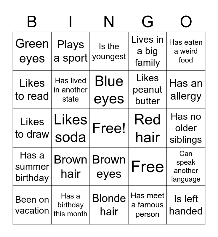 This bingo card has a free space and 25 words: Brown hair, Blonde hair, Blue eyes, Been on vacation, Has eaten a weird food, Green eyes, Likes to read, Plays a sport, Red hair, Brown eyes, Likes peanut butter, Likes to draw, Free, Can speak another language, Has lived in another state, Has a dog, Has no older siblings, Is the youngest, Has an allergy, Likes soda, Is left handed, Has a birthday this month, Has a summer birthday, Lives in a big family and Has meet a famous person.
