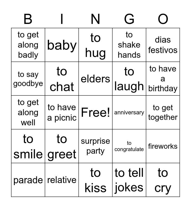 This bingo card has a free space and 24 words: to greet, relative, elders, parade, dias festivos, to get along badly, to say goodbye, baby, anniversary, surprise party, to laugh, to get along well, to congratulate, fireworks, to chat, to tell jokes, to get together, to hug, to have a birthday, to have a picnic, to cry, to smile, to shake hands and to kiss.