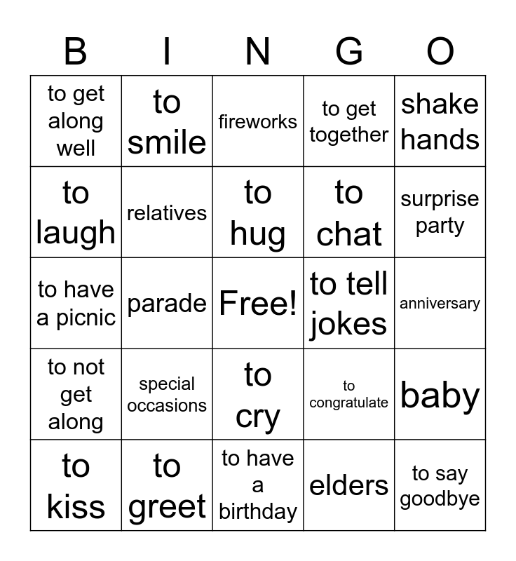 This bingo card has a free space and 24 words: special occasions, to greet, to hug, to kiss, shake hands, to get along well, to laugh, to smile, to tell jokes, to cry, to chat, to have a picnic, to congratulate, baby, relatives, elders, anniversary, fireworks, surprise party, parade, to say goodbye, to not get along, to get together and to have a birthday.