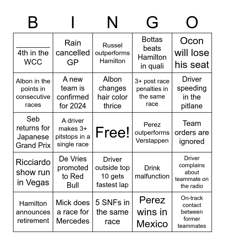 This bingo card has a free space and 122 words: Verstappen 3rd WDC, Alonso wins a race, Sainz DNFs in the gravel, Sub 1.8 second pitstop, Leclerc wins in Monaco, Ferrari strategy ruins both drivers’ race, twice, Rain cancelled GP, Leclerc 1st WDC, 5 SNFs in the same race, Different winners for WDC and WCC, Someone mistakes de Vries for “debris”, Stroll beats Alonso in quali, Sainz wins in Spain, Charles converts >half his poles to wins, Hulkenberg podium, Sergeant podium, Hamilton announces retirement, Toto throws a headset and/or slams a table, Hamilton 8th WDC, Zhou podium, Perez wins in Mexico, Albon changes hair color thrice, Russell DNFs 3 drivers, French Alpine drama, Lando wins a race, Bottas beats Hamilton in quali, Mick does a race for Mercedes, Danny Ric does a race, Alonso DNFs less than his teammate, Multiple botched pitstop because of tyres in one race, Piastri will beat Norris in WDC, Seb returns for Japanese Grand Prix, Ricciardo show run in Vegas, Verstappen and Hamilton Collide, Russel 1st WDC, "Two teams suffer from porpoising, ____, Commentary about how good the Italian national anthem is, Hot midfield battle gets poor TV coverage, Less than 10 mins of race leader coverage, William’s unexpected strategy pays off, Lots of hype about rain that doesn’t come, Driver laps their teammate, Team orders swap mid-season, Ham-Bot-Ver podium, any order, Commentary about Max and Charles being karting rivals, Win from below 10th place, not Verstappen, Blue flag incident, DRS malfunction, A driver makes 3+ pitstops in a single race, Two teams double DNF in the same race, 3+ post race penalties in the same race, A driver gets 3+ penalties in a race, Non top-three team gets a 1-2, Singing on the radio, A driver makes a perfect spin during the race and continues on, Haas makes Q3, 5+ cars out in lap 1, Pit lane —> podium, Driver speeding in the pitlane, On-track contact between former teammates, Last lap overtake, Last lap overtake for the lead, Lead changes 4+ times in a race, 5+ drivers with grid penalty in a single race, A new team is confirmed for 2024, Teammates swap positions during the race — true overtake, Team orders are ignored, Radio malfunction, Drink malfunction, Perez outperforms Verstappen, Russel outperforms Hamilton, Sainz outperforms Leclerc, Ocon on the podium, Race ends behind the safety car, Sergeant’s first points, ________ 4th in the WCC, ________ 2nd in the WCC, ________ 1st in the WCC, ________ 3rd in the WCC, Norris on pole, Driver complains about teammate on the radio, Albon in the points in consecutive races, Both Aston Martins in Q1, Sprint winner wins GP, Sprint winner does not win GP, Two grand slams by different drivers, Race in which starting order = finishing order, 10+ second pitstop without a penalty, Race without any incidents, Piastri on the podium, Max does not win any of his home races, Non-top 3 team has the highest straight-line speed, A different team tops every session of a race weekend, Hards are the best race tyre, All rookies score points, Ferrari engine has <3 failures, Tsunoda ahead of Gasly in WDC, Only one driver on slicks in a wet race (intentionally), Driver outside top 10 gets fastest lap, Race starts under the safety car, 2+ new race winners, 2+ drivers retire from F1, Seb returns in a non-driver role (does not have to be permanent, but not just a spectator), Ferrari win either the WDC or the WCC, but not both, Ocon will lose his seat, Lewis ahead of George in WDC, Perez will lose his seat, Williams will not finish last, One of the new rookies will lose their seat, Max will win the WDC and retire, Leclerc will look for a new team, One driver will win more than 50% of the races, Adrian Newey Retires, De Vries promoted to Red Bull, A corner/track/straight will be renamed, One of the top three teams will finish outside the top three, Championship decided in the last race, 1+ new pole-sitters, Both Alpha Tauri drivers are replaced, Every team scores points and Red Bull falls behind.