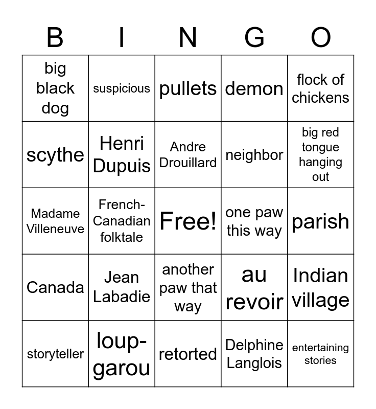 This bingo card has a free space and 24 words: Jean Labadie, loup-garou, Andre Drouillard, storyteller, flock of chickens, big black dog, scythe, suspicious, one paw this way, another paw that way, neighbor, Madame Villeneuve, au revoir, Indian village, Henri Dupuis, Delphine Langlois, parish, pullets, big red tongue hanging out, French-Canadian folktale, entertaining stories, Canada, demon and retorted.