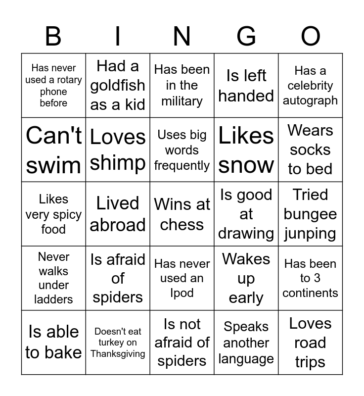 This bingo card has a free space and 24 words: Is afraid of spiders, Doesn't eat turkey on Thanksgiving, Uses big words frequently, Is able to bake, Has a celebrity autograph, Has never used a rotary phone before, Can't swim, Had a goldfish as a kid, Is good at drawing, Has never used an Ipod, Likes snow, Likes very spicy food, Wakes up early, Has been to 3 continents, Loves shimp, Speaks another language, Tried bungee junping, Has been in the military, Wears socks to bed, Lived abroad, Loves road trips, Never walks under ladders, Is left handed and Is not afraid of spiders.
