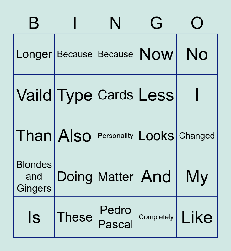 This bingo card has a free space and 24 words: Doing, These, Cards, Is, No, Longer, Vaild, Because, Looks, Matter, Less, Than, And, My, Type, Completely, Changed, Because, I, Also, Like, Blondes and Gingers, Now and Pedro Pascal.