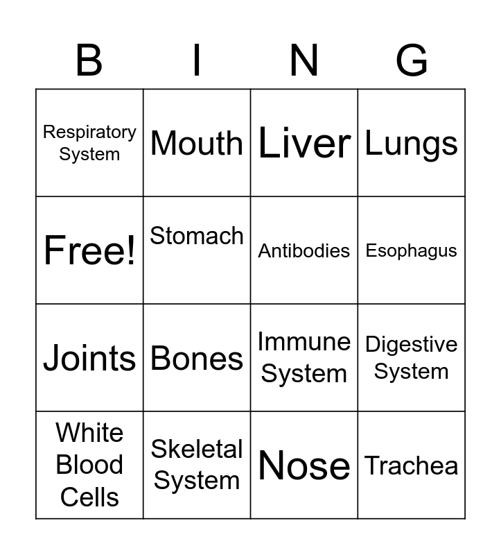 This bingo card has 16 words: Skeletal System, Digestive System, Liver, Respiratory System, Joints, Mouth, Immune System, Nose, Free!, Stomach, White Blood Cells, Lungs, Bones, Esophagus, Antibodies and Trachea.