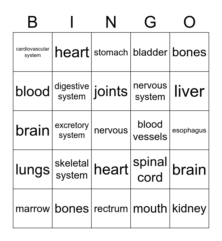 This bingo card has a free space and 24 words: skeletal system, bones, joints, marrow, bones, cardiovascular system, blood, heart, blood vessels, heart, nervous system, brain, spinal cord, brain, digestive system, mouth, esophagus, stomach, liver, excretory system, kidney, lungs, bladder and rectrum.