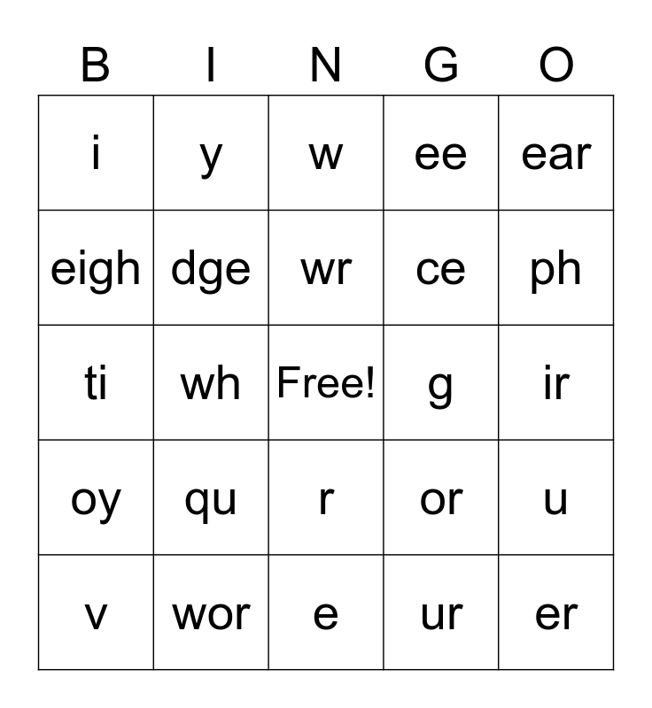 This bingo card has a free space and 30 words: wor, ay, wh, ew, i, w, dge, r, g, e, ir, er, ur, ge, ph, ea, or, oy, qu, ear, ti, ai, y, ce, eigh, ee, u, v, wr and gi.