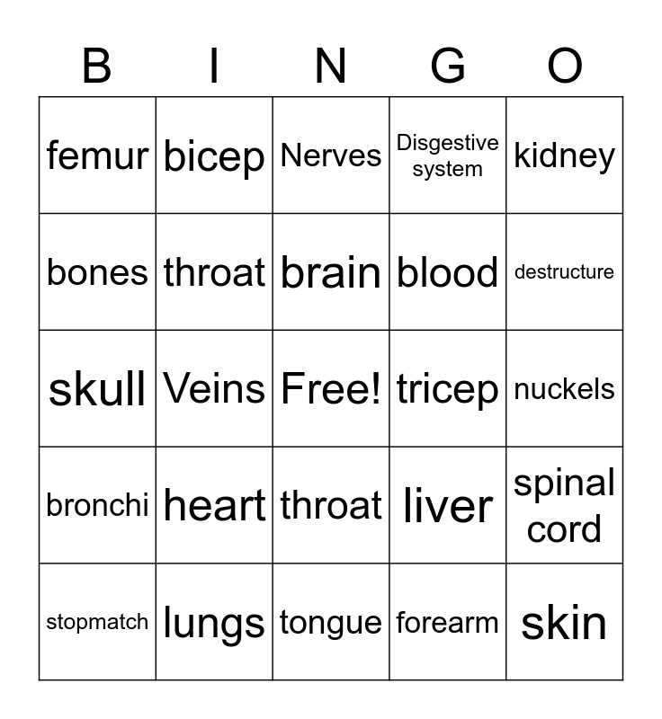 This bingo card has a free space and 24 words: heart, lungs, brain, stopmatch, kidney, femur, bones, bicep, tricep, throat, blood, skull, liver, spinal cord, throat, forearm, nuckels, Nerves, destructure, Veins, skin, bronchi, Disgestive system and tongue.