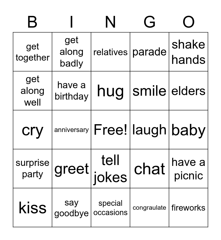 This bingo card has a free space and 24 words: greet, say goodbye, hug, kiss, shake hands, get together, get along well, get along badly, laugh, tell jokes, smile, cry, chat, have a picnic, have a birthday, congraulate, baby, relatives, elders, anniversary, fireworks, surprise party, parade and special occasions.