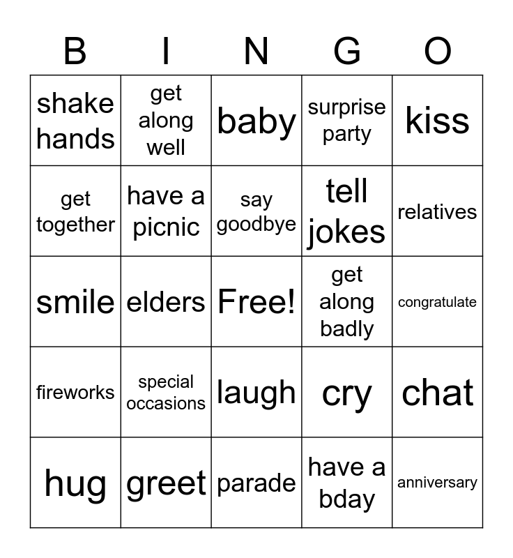 This bingo card has a free space and 24 words: special occasions, greet, say goodbye, hug, kiss, shake hands, get together, get along well, get along badly, laugh, tell jokes, smile, cry, chat, have a picnic, have a bday, congratulate, baby, relatives, elders, anniversary, fireworks, surprise party and parade.