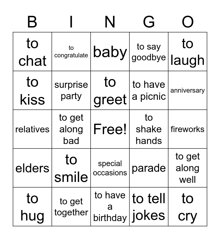 This bingo card has a free space and 24 words: to smile, to get together, to greet, to hug, to laugh, to chat, to kiss, to congratulate, to shake hands, special occasions, to have a picnic, relatives, parade, to get along well, surprise party, to tell jokes, fireworks, baby, anniversary, to get along bad, to cry, elders, to say goodbye and to have a birthday.